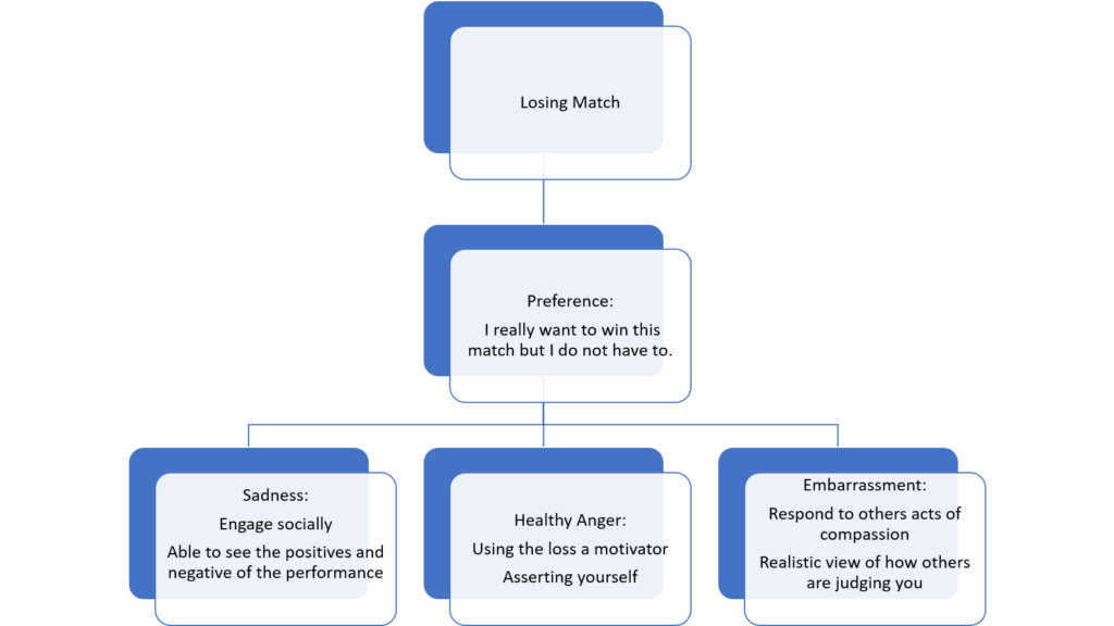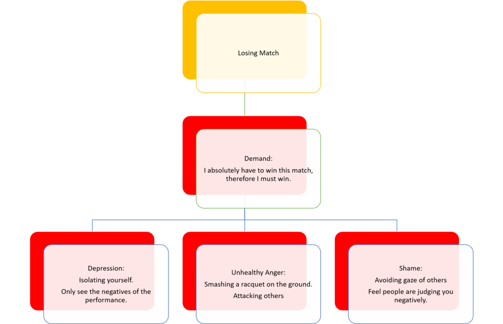 Within REBT there two categories of beliefs rigid, extreme, irrational beliefs (iB) and flexible and pragmatic, rational beliefs (rB). These two sets of beliefs consist of 4 categories, with the iB’s triggering unhealthy negative emotions (UNE) and rB’s triggering healthy negative emotions (HNE). An important aspect to bear in mind is that you will still feel negative emotions as a result of an event but they will be more helpful in the long run. Lets go back to the scenario of losing a match, if you demand that “I absolutely have to win, therefore I must” then the irrational beliefs could trigger emotions such as anger, shame, or depression. When an individual hold a preference “I really want to win but I do not have to” in this situation then the associated rB’s could trigger a healthy anger, embarrassment, or sadness. Figure 2 highlights these different emotions and the thoughts and behaviours that could accompany them, drawing on examples given by Bennett & Turner (2018).